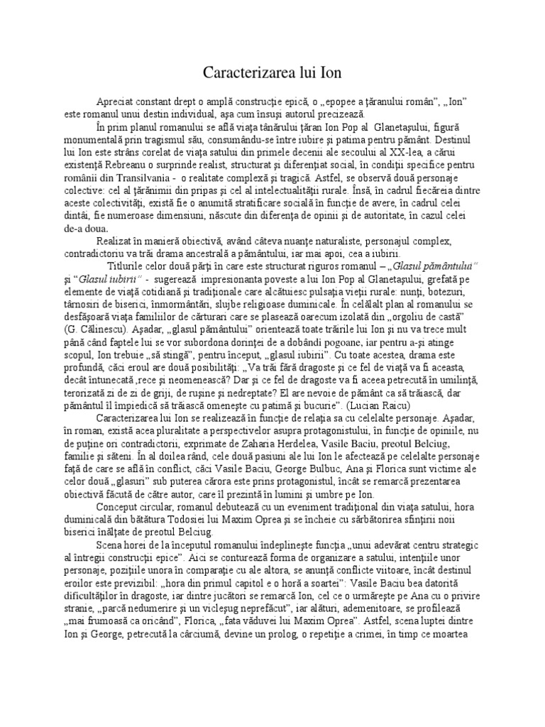 Ion glanetașu caracterizare. Academia edu is a platform for academics to share research papers. Liviu rebreanu creează în opera sa ion o galerie bogată de personaje dominantă fiind imaginea lui ion simbolul individual al ţăranului român setos până la patimă de pământurile lui realizat în manieră realistă cu câteva nuanţe naturaliste personajul va trăi drama pământului şi apoi drama iubirii caracterul său dezvăluindu se atât în mod direct portret. Romanul ion de liviu rebreanu cel care deschide în 1920 seria marilor romane ale literaturii interbelice are în centru figura emblematică a personajului eponim ion pop al glanetaşului.