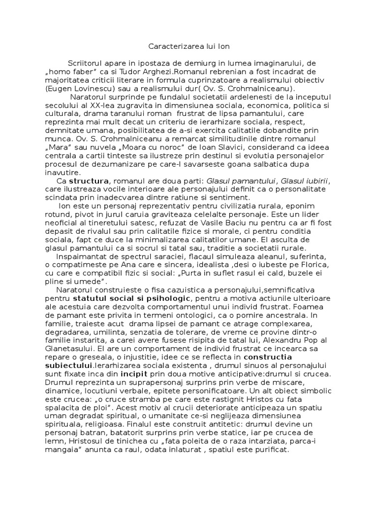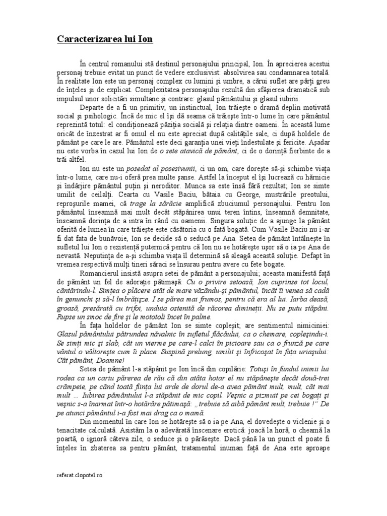 Caracterizarea lui ion. Realizat în manieră realistă cu câteva nuanţe naturaliste personajul va trăi drama pământului şi apoi drama iubirii caracterul său dezvăluindu se atât în mod direct portret. Caracterizarea lui ion prin gesturi si atitudini exista un limbaj gestual care poate fi uneori mai expresiv decat cuvintele comunicand despre individ mai mult decat acestea. Caracterizare ion de liviu rebreanu. Liviu rebreanu a fost un scriitor nuvelist prozator romancier şi academician român.
