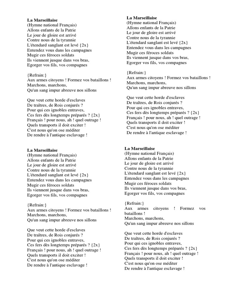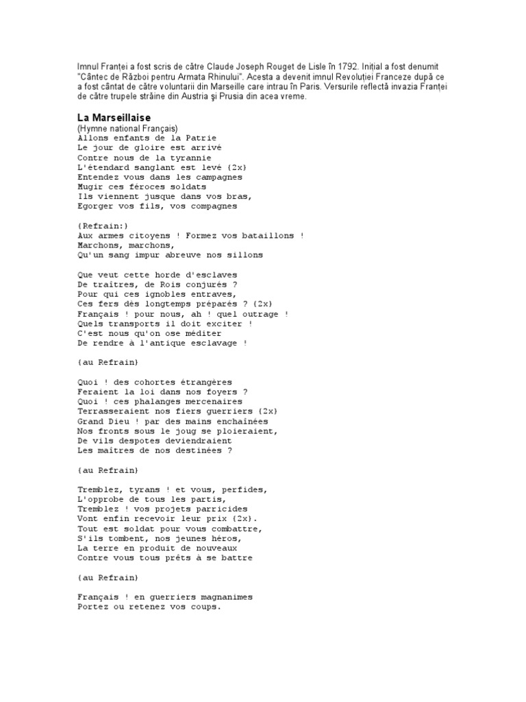 La marseillaise versuri. La marseillaise is the national anthem of france. La marseillaise is the french national anthem. Allons enfants de la patrie le jour de gloire est arrivé. The song acquired its nickname after being sung in paris by volunteers from marseille marching to the capital.