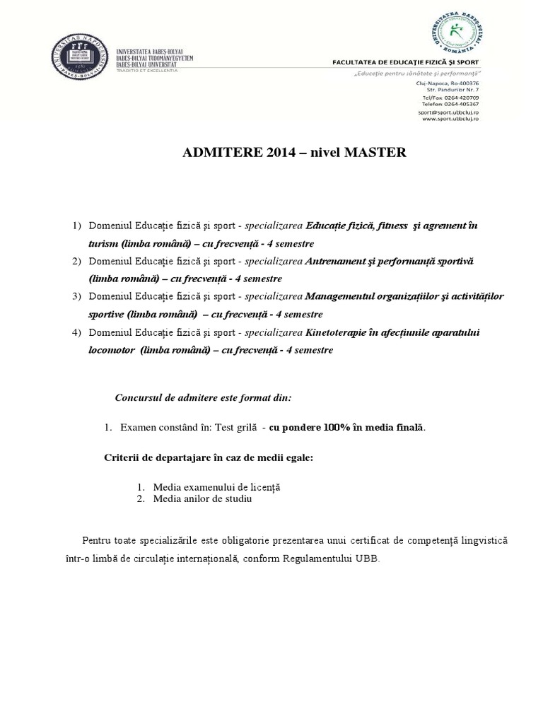 Admitere 2020 2021 kinetoterapia în afecţiunile locomotorii. în alte centre universitare din ţară programele de studii în domeniul de licenţă kinetoterapie se desfăşoară în cadrul facultăţilor de educaţie fizică şi sport sau în cadrul unor. în atenţia studenţilor unefs secretariat general 1. Metodologie de admitere studii de master 2015 2016.