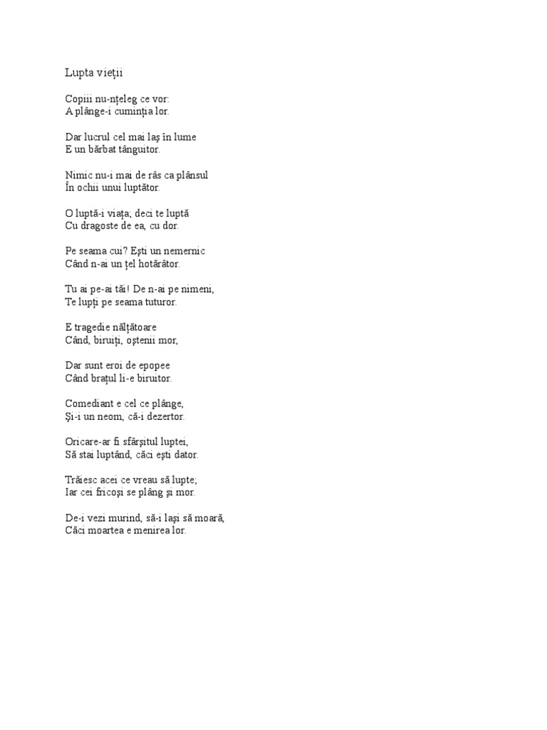 George cosbuc in interesul artei eu mai bine vreai sa sufere intr adevar poetii si sa cante dureri adevarate decat sa le mearga bine si sa si inchipuiasca numai ca sufar. Nu poți schimba ceea ce a fost dar în schimb poți alege ce faci mai departe și cum poți să pui în aplicare ceea ce ai învățat. Te lupti cu ispite te lupti cu altii te lupti pentru ceva sau pentru cineva te lupti cu tine. O lupta i viata publicat pe 15 aprilie 2013 de fotbaldragosteamea sunt persoane care se consoleaza devreme si traiesc precum vulpea intr o vizuina ascunse resemnate bolnavicioase pe cand viata lor este inca la apogeu mai dau si sfaturi altora sau eticheteaza pe altii care incearca mai mult militeaza pentru avansare sociala si individuala.