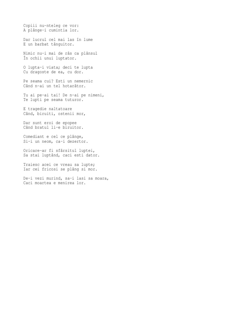 Nimic nu i mai de ras ca plansul in ochii unui luptator. O lupta i viata deci te lupta cu dragoste de ea cu dor. E momentul să găsești puterea de a trece peste. George cosbuc incercarea si atunci cand nu reuseste e o scoala.