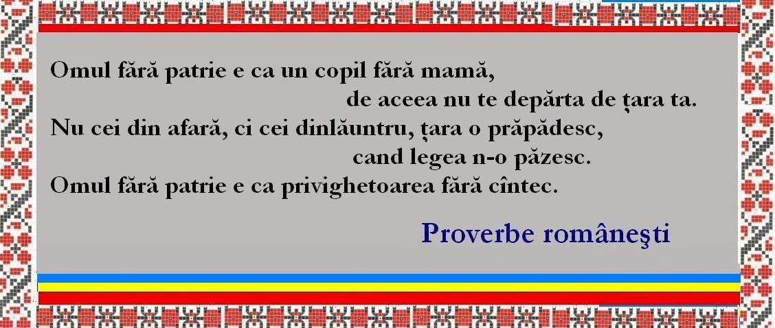 Proverbe despre patrie. Prin navigarea pe acest site va exprimati acordul asupra folosirii cookie urilor. Patriot cineva pentru care interesele unei parti par superioare fata de cele ale intregului pacalitul politicienilor si unealta cuceritorilor. Acest site foloseste cookies. Ajută să cânte patria sa ca ceva frumos cel mai bun din lume ceva cu care nici o altă țară nu poate fi pus într un număr de nu există nimic în lume mai frumos decât patria noastră un om fără o țară o privighetoare fără un cântec în acest caz evidențiază importanța patriei pentru persoana incapacitatea de a exista fără el și în afara lui.