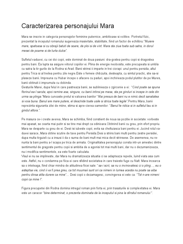 Ideea ecranizării romanului mara i a aparținut prozatorului alexandru ivasiuc directorul casei de filme 1 1972 1974 care i a propus regizorului mircea veroiu să scrie scenariul. Caracterizarea personajului mara bârzovanu din romanul mara de ioan slavici la aniversară de mihai eminescu comentariu literar rezumat literar iapa lui vodă de mihail sadoveanu comentariu literar rezumat literar. Mara birzovanu sotul decedat al marei persida trica maica aegidia gheorghe varul marei bocioaca marta anton hubar hubaroaie ignatus hubar natl claici milena munteanu logotnicul milenei seca lena pavel codreanu anca liubicek tovarasul lui natl protopopul gheorghe al lui balta iovita al lui borleu cojocarii macelarii andrei varul lui bocioaca emilia si nina. în fiecare zi mara pune bani în cei trei ciorapi care sunt unul pentru înmormantare unul pentru persida fata ei şi unul pentru trică baiatul ei.