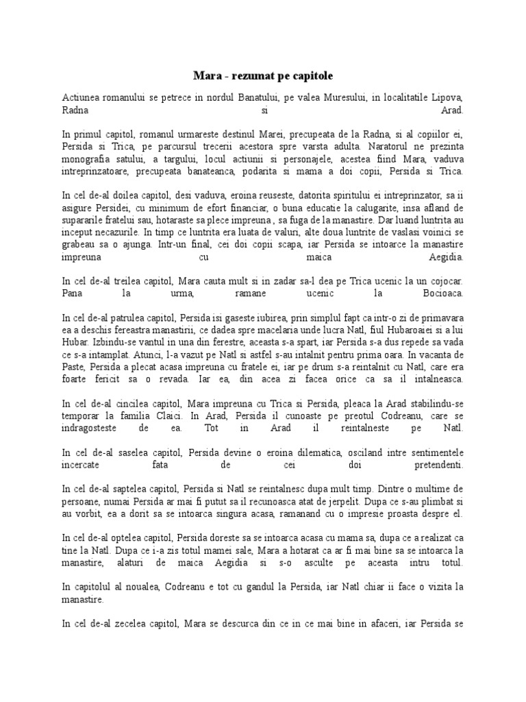 Mara se repezi la usa si da peste talia o chema la persida careia ii era rau la jumatatea podului mara se intoarce spre trica care a refuzat sa vina la sora lui. Rebreanu reprezintă prima contribuţie. Este prezentata mara ca fiind o vaduva saraca cu doi copii persida si. Rezumatul trateaza in parte fiecare dintre cele 21 capitole ale romanului.