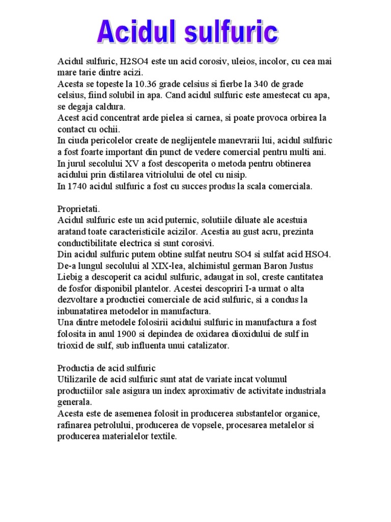 Utilizarile acidului sulfuric. învăţământ gimnazial chimie lecţii clasa a 8 a. One of the most important of all chemicals prepared industrially by the reaction of water with sulfur trioxide. Utilizarea acidului sulfuric mai jos o sa aveti mai multe rezultate pentru cautarea utilizarea acidului sulfuric. 2 aprilie 2010 09 55.